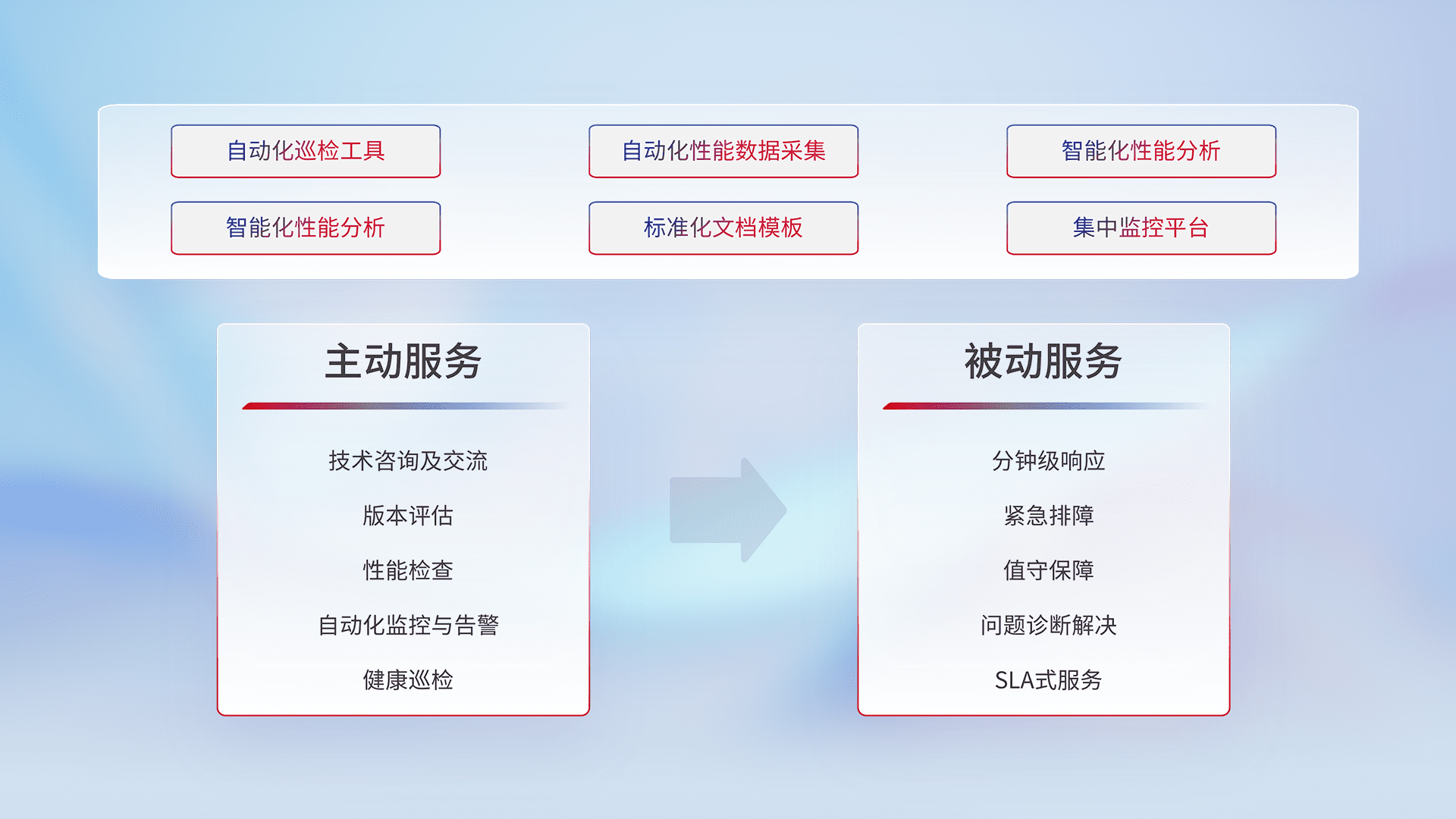 智能化工具和标准化文档,,,保障服务质量,,,提供主动服务(包含技术咨询、、、、版本评估、、、、性能检查、、、、自动化监控与告警、、、、健康巡检)和被动服务包含(分钟级响应、、紧急排障、、值守保障、、、问题诊断解决、、SLA服务)。。。